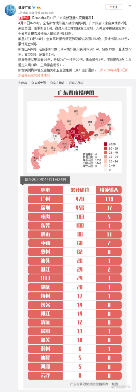 截至4月11日24时,全省累计报告新冠肺炎确诊病例1552例,累计出院1443例,累计死亡8例。