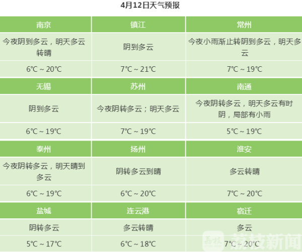 记者今天(4月11日)从江苏省气象台获悉:短暂的风雨过后,明天伴随着阳光重现,气温将回升,最高气温全省18-19℃。但早间气温依然低迷,最低温度东部地区4-5℃,其它地区6-7℃。
