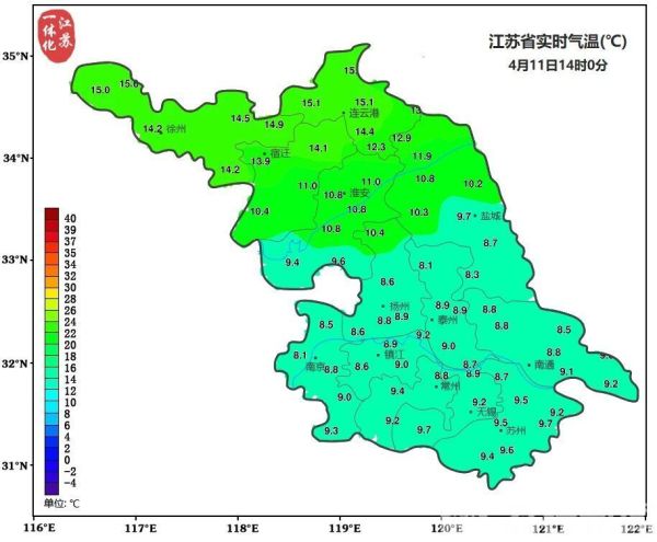 4月10号夜里起,江苏迎来一场春雨,淮河以南地区气温下降明显。今天早晨的最低气温淮北地区5-6℃,苏南地区12℃左右。而午后的最高气温,淮北地区14-15℃,苏南地区却只有9℃左右。部分地区单日降温幅度达到或超过了10℃。