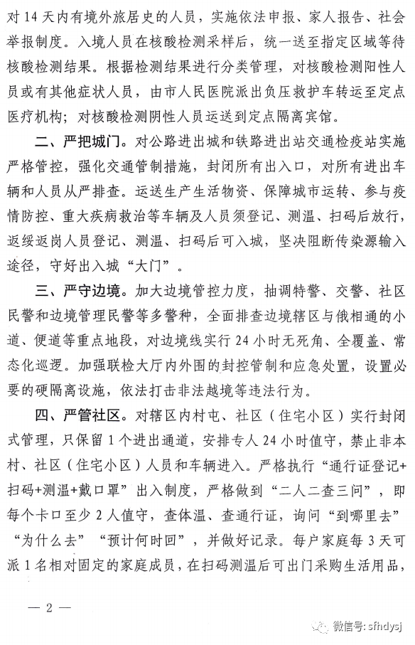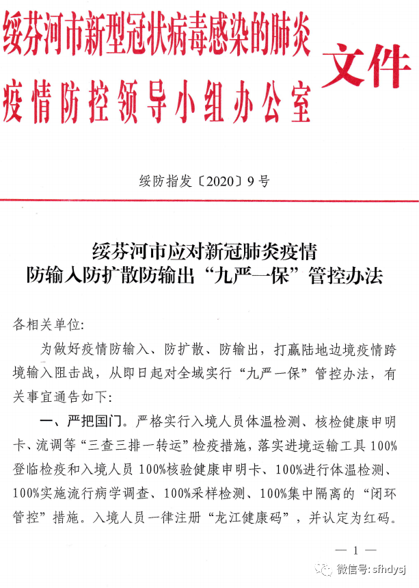 为打赢陆地边境疫情跨境输入阻击战,绥芬河对全域实行“九严一保”管控办法,即严把国门、严把城门、严守边境、严管社区、严格隔离、严控交通、严防聚集、严肃执法、严抓督战、保障民生。