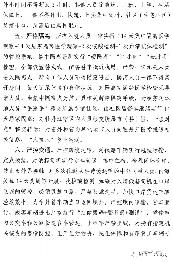 “严格隔离”一条中提出,所有入境人员一律实行“14天集中隔离医学观察+14天居家隔离医学观察+2次核酸检测+1次血清抗体检测”的管控措施。“严控交通”中指出,要严控跨境运输,对俄籍车辆实行甩挂运输、定点换装,对俄籍司机实行专车转运、集中住宿,全程闭环管理,防止与外界接触。