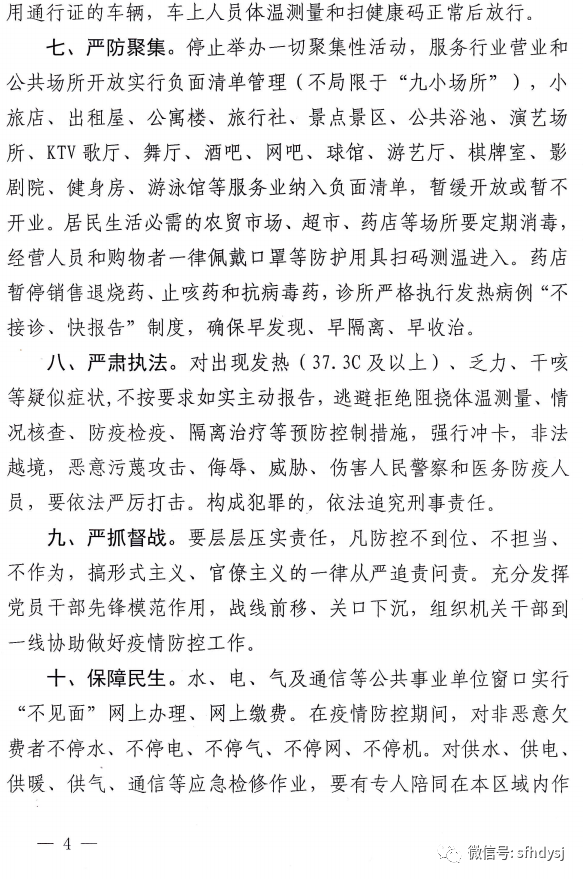 涉及当地市民生活的其中一条为“严管社区”,对辖区内村屯、社区(住宅小区)实行封闭式管理,严格执行“通行证登记+扫码+测温+戴口罩”出入制度,严格做到“二人二查三问”,即每个卡口至少二人值守,查体温、查通行证,询问“到哪里去”为什么去”“预计何时回”,并做好记录。