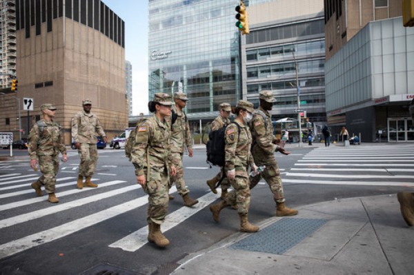 4月8日,在美国纽约,美军士兵从一家医院外走过。新华社发(郭克摄)