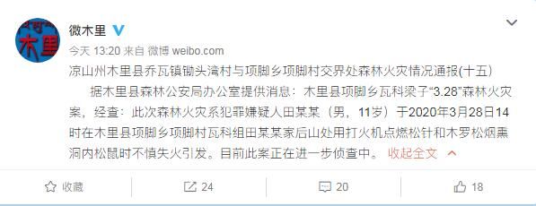 据木里县森林公安局办公室提供消息:木里县项脚乡瓦科梁子“3.28”森林火灾案,经查:此次森林火灾系犯罪嫌疑人田某某(男,11岁)于2020年3月28日14时在木里县项脚乡项脚村瓦科组田某某家后山处用打火机点燃松针和木罗松烟熏洞内松鼠时不慎失火引发。目前此案正在进一步侦查中。
