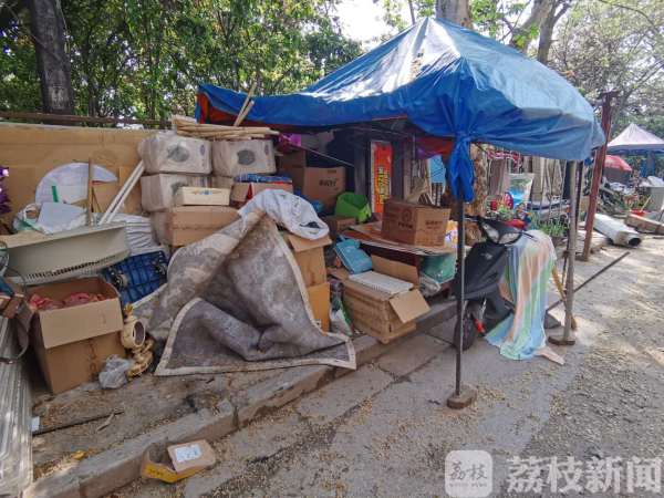 4月12号下午,在南京市鼓楼区华侨路街道红土山路,记者看到,沿路的一楼居民,几乎每户人家都搭建了违章建筑,把一些物品和垃圾堆放在建筑里,居民楼对面就是石头城公园的围墙和人行道,居民们也把大量的物品和垃圾堆放在人行道上。甚至在人行道上搭起窝棚,对外出租,用来住人。一位居民和城管人员抱怨该区域卫生环境太差,可城管人员调查发现,该居民违章搭建反而最多。