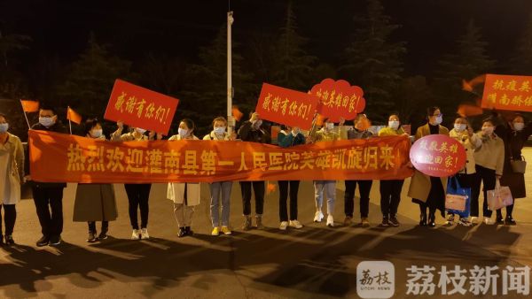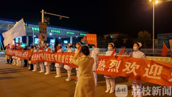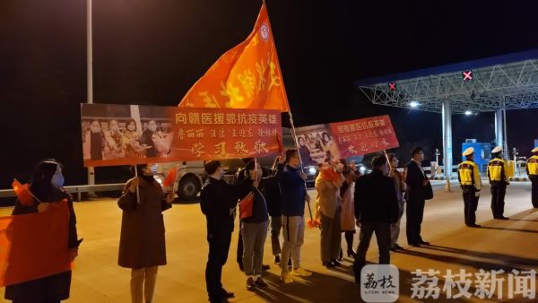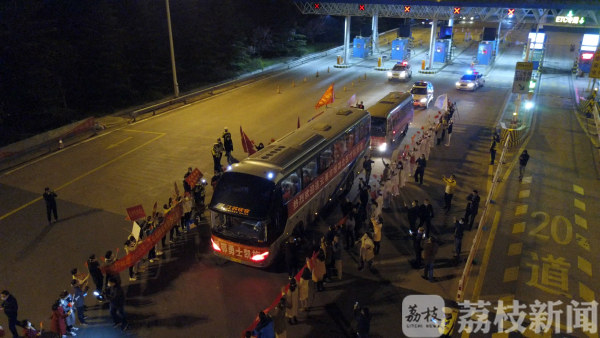 在连霍高速的渔湾收费站,连云港交警部门专门开辟了一个通道,医疗队队员家属和同事们冒着寒风在高速口迎接英雄回家。