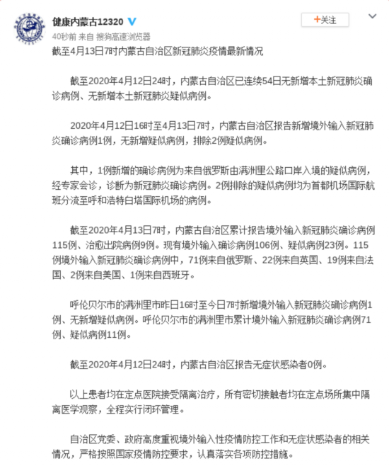 2020年4月12日16时至4月13日7时,内蒙古自治区报告新增境外输入新冠肺炎确诊病例1例,无新增疑似病例,排除2例疑似病例。