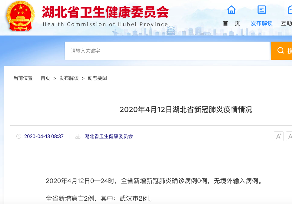 荔枝新闻讯 据湖北省卫健委网站消息,2020年4月12日0—24时,湖北省新增新冠肺炎确诊病例0例,无境外输入病例。