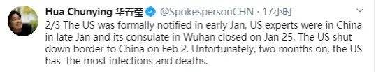 “有着14亿人口和960万平方公里土地的中国已经控制了疫情。美国加油,保持强大!”中国外交部发言人华春莹12日又发推了。这次,她连发多条推文,介绍中国的抗“疫”举措,并为目前累计确诊新冠肺炎病例数居全球第一的美国“加油”。