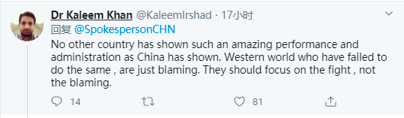 “西方国家的声音很强烈,一直妖魔化中国,这很离谱!这是在破坏世界和平。无视事实只会让疫情夺走更多的生命!这些满腹偏见的可耻政客应该下地狱!”