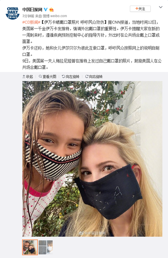 据CNN报道,当地时间12日,美国第一千金伊万卡发推特,强调外出戴口罩的重要性。伊万卡提醒大家在新的一周到来时,遵循疾病预防控制中心的指导方针,外出时在公共场合戴上口罩或面罩。