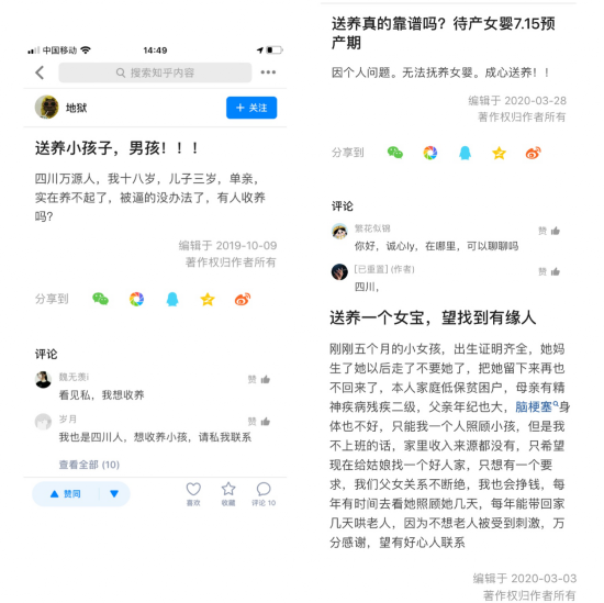例如,法治周末记者在知乎APP上以“送养”为关键词进行搜索,随即找到多条“送养小孩”信息。记者注意到,在多条信息下方,都有同一位网友。她在头像旁边留下了自己的QQ号码 。