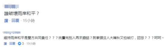 听到这样的言论,有岛内网民留言反问,谁在破坏两岸和平?挑衅完人家再来废话?拳头没人大,嘴臭又怕被打,认怂?↓
