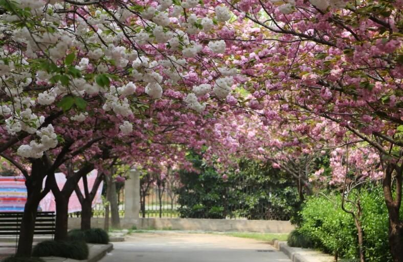 在明珠小区的9号楼和10号楼的道路两边,粗壮的樱花树夹道而生,繁茂的树杈层叠相擎,一簇簇樱花布满枝桠,或粉或白,吸引着许多小区居民驻足欣赏,拍照留念。