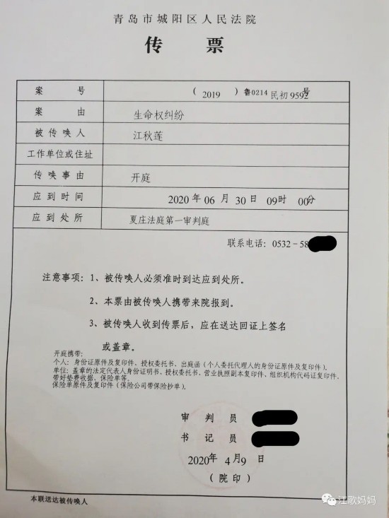 新京报讯 江歌母亲江秋莲以生命权纠纷为由对刘鑫提起诉讼。新京报记者今日(4月13日)从江歌的母亲江秋莲处获悉,她已接到法院的开庭传票,法院已定于今年6月30日上午9点在青岛市城阳区法院夏庄法庭开庭审理此案。