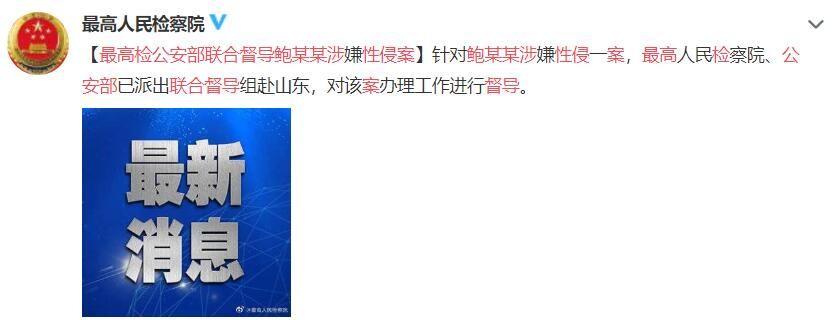4月13日下午,@最高人民检察院 官微通报:针对鲍某某涉嫌性侵一案,最高人民检察院、公安部已派出联合督导组赴山东,对该案办理工作进行督导。