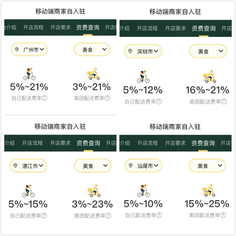 以广州为例,商家自行配送外卖的佣金在5%-21%之间,而选择美团配送则在3%-21%之间。深圳市商家自行配送和美团配送的佣金水平,则分别是5%-12%、16-21%。