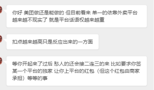 还有商家表示,自己做“实体经营+线上经营”,从外卖双平台4000单到被迫美团独家后只有2000单,无法承受经营压力重启双平台后,美团后台立刻以战略合作违规处理,导致其店铺转让。