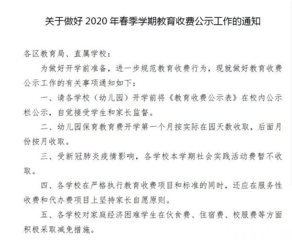 同时教育部门要求,幼儿园保育教育费开学第一个月按实际在园天数收取,后面按月收取。受新冠肺炎疫情影响,各学校本学期社会实践活动费暂不收取。各学校在严格执行教育收费项目和标准的同时,还应在服务性收费和代办费项目上坚持家长自愿原则。如果您在交费过程中遇到乱收费的情况,欢迎向荔枝新闻反映。