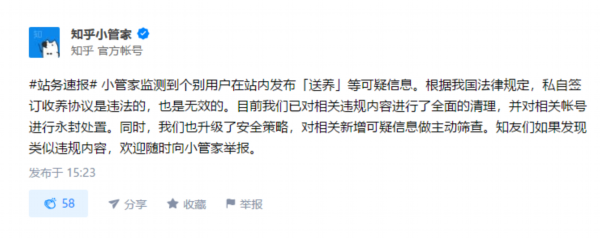 知乎方面表示,目前已对相关违规内容进行了全面的清理,并对相关帐号进行永封处置。同时知乎升级了安全策略,对相关新增可疑信息做主动筛查。