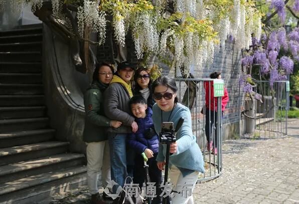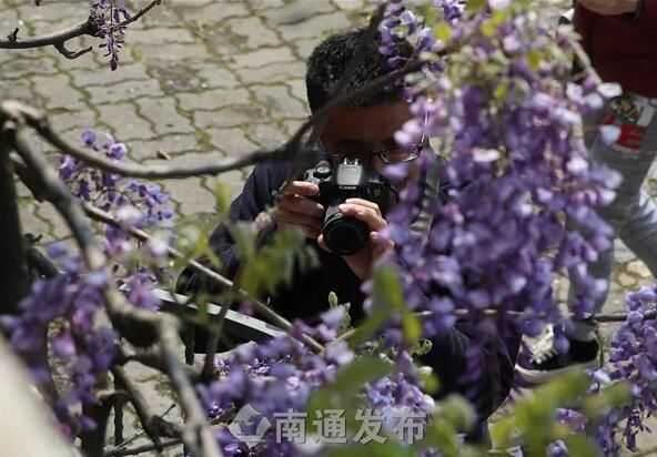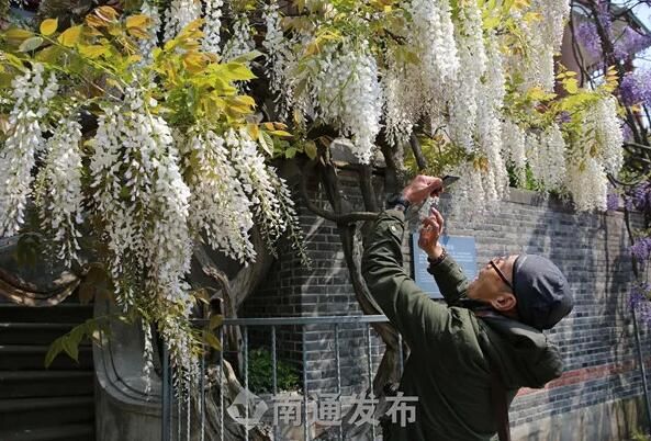 4月12日,南通博物苑两株百余年树龄紫藤盛开,吸引了众多市民前来观赏、拍照。