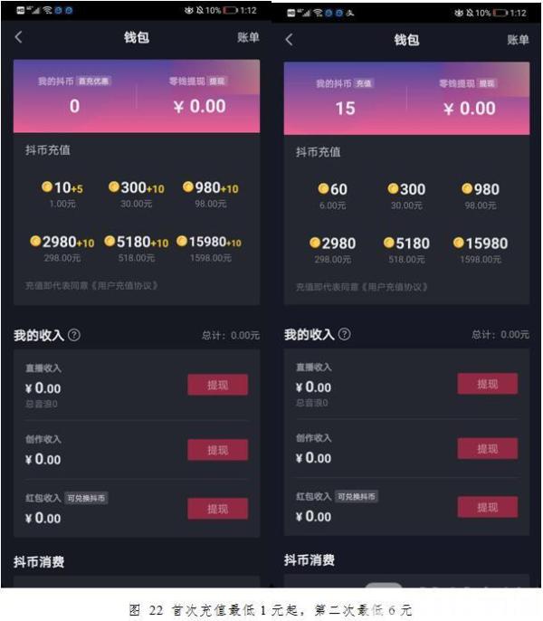 在9个直播平台中,快手单次充值金额最高,达100万元;一直播达99.9999万元。抖音首次充值最低可充1元,第二次最低充值6元。TT语音华为手机最低充值6元起,苹果手机最低充值60元起,不同型号手机最低充值金额不相同。斗鱼平台苹果手机1元可购买鱼翅数量0.7个,华为手机1元可购买鱼翅数量1个,不同型号手机的充值所代表的虚拟币值也不同。