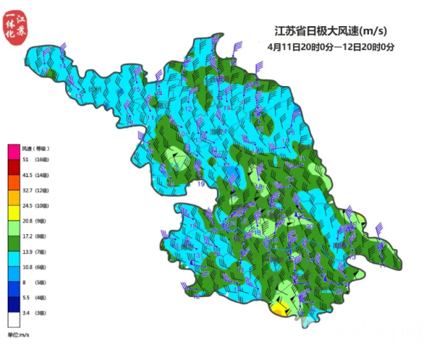 上周受冷空气持续南下影响,10-12日出现大风降温天气,江苏大部分地区出现7-8级、局部9-10级的大风。