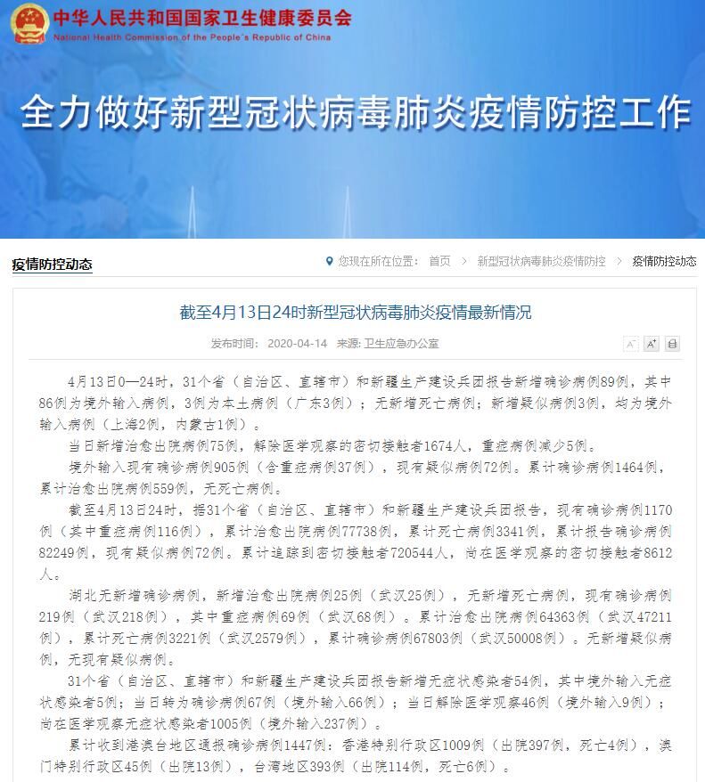 4月13日0—24时,31个省(自治区、直辖市)和新疆生产建设兵团报告新增确诊病例89例,其中86例为境外输入病例,3例为本土病例(广东3例);无新增死亡病例;新增疑似病例3例,均为境外输入病例(上海2例,内蒙古1例)。