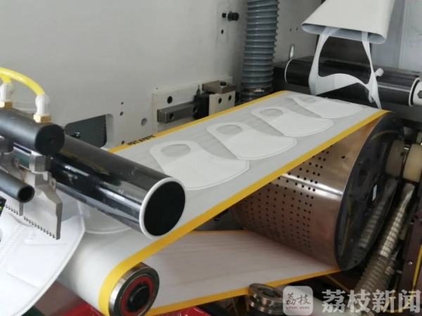 自动圈材上料、折叠压合、鼻梁筋上料、口罩成型、口罩切断、耳带上料及焊接、成品下料……记者记录下生产车间口罩机高效完成全生产过程。