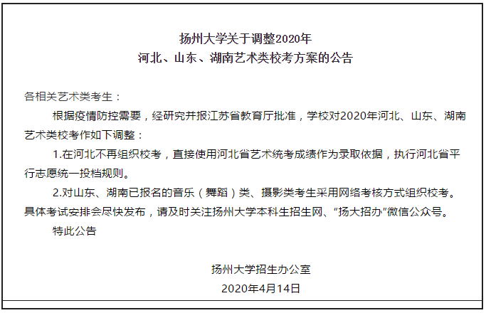今天(4月4日),扬州大学招生办公室发布了关于调整2020年河北、山东、湖南艺术类校考方案的公告,具体内容如下: