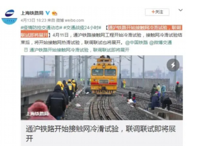 4月13日,上海铁路局官方微博发布了一篇题为《通沪铁路开始接触网冷滑试验,联调联试即将展开》的博文。