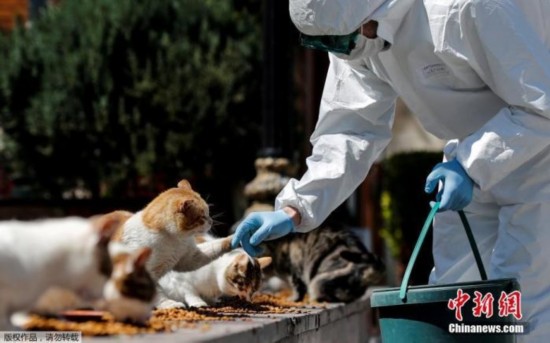 当地时间4月9日,土耳其伊斯坦布尔,一名身穿防护服的市政工作人员在Sultanahmet广场喂流浪猫。