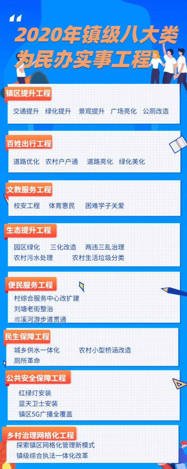 棠张镇决定,将在2020年推出八大类重要民生实事项目,内容涉及优化基本公共服务、改善群众居住条件、提升生活便利性、方便居民出行等八个方面。