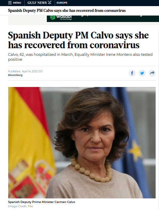 【环球网快讯 记者 王博雅琪】据《海湾新闻》(Gulf News)最新消息,此前感染新冠病毒的62岁西班牙副首相卡门 卡尔沃14日在推特上宣布了自己已经痊愈的消息。