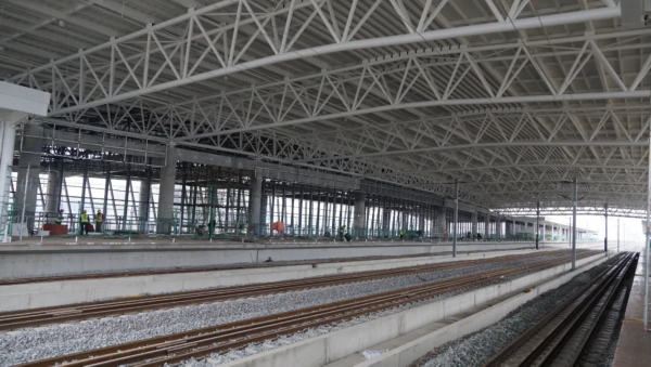 主体工程已经完工,屋顶和外幕墙南、北、西立面施工完成,东立面龙骨安装完成,正在进行内部装修。同时新增建设动车存车线项目,将张家港站沪通铁路预留的5道作为了动车存车和终到、始发线路。