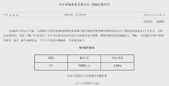 从2020年4月15日开始,人民银行对农村金融机构和仅在省级行政区域内经营的城市商业银行定向下调存款准备金率1个百分点,分两次实施到位,每次下调0.5个百分点。今日为实施该政策的首次存款准备金率调整,释放长期资金约2000亿元。
