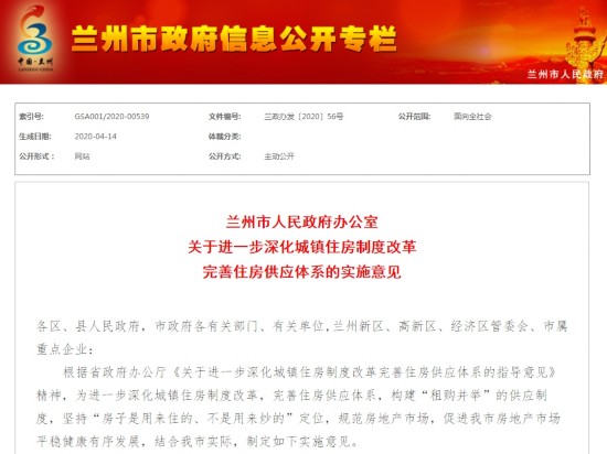 为进一步深化城镇住房制度改革,完善住房供应体系,构建“租购并举”的供应制度,坚持“房子是用来住的、不是用来炒的”定位,规范房地产市场,促进兰州市房地产市场平稳健康有序发展,结合兰州市实际,兰州市人民政府办公室制定该实施意见。