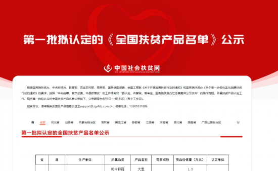 日前,中国社会扶贫网公布了第一批拟认定的《全国扶贫产品名单》。第一批拟认定的全国扶贫产品覆盖区域为:河北省、山西省、内蒙古自治区、吉林省、黑龙江省、安徽省、江西省、河南省、湖北省、湖南省、广西壮族自治区、海南省、重庆市、四川省、贵州省、云南省、西藏自治区、陕西省、甘肃省、青海省、宁夏回族自治区和新疆维吾尔自治区。