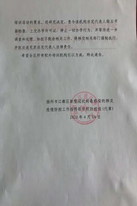 扬州市江都区新型冠状病毒感染的肺炎疫情防控工作指挥部学校防控组表示,扬州市领军教育培训中心在新冠肺炎疫情防控期间,不顾学生的生命健康,不服从主管部门的管理,未经批准擅自违规开展线下培训活动,违反了省新冠肺炎疫情防控工作领导小组《关于明确2020年春季培训机构恢复线下集中培训相关要求的通知》中“校外培训机构恢复线下集中培训活动的时间在当地中小学全部开学后由各设市区疫情防控工作领导指挥机构确定”及江都区要求培训机构一律停止线下培训活动的要求。经研究决定,责令该机构法定代表人做出书面检查、上交办学许可证、停止一切办学行为,并等待进一步调查和处理。如拒不配合相关工作,将移交相关部门强制执行,并依法追究其法定代表人法律责任。希望江都区所有校外培训机构引以为戒。
