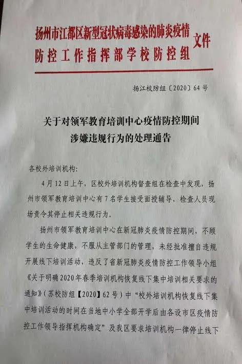 日前,扬州市江都区新型冠状病毒感染的肺炎疫情防控工作指挥部学校防控组发布《关于对领军教育培训中心疫情防控期间涉嫌违规行为的处理通告》。
