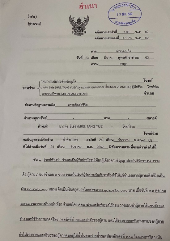 基于上述考虑,被害者家属于今年3月23日,正式将上诉文件提交给普吉府法院。章红媛对新京报记者表示,“目前,普吉府法院已呈递给泰国第八区上诉法院。”