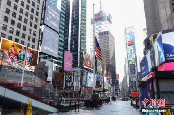 资料图:当地时间4月12日,纽约时代广场的美国国旗降半旗向新冠肺炎逝者志哀。 中新社记者 廖攀 摄
