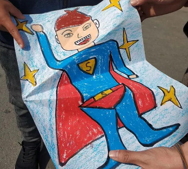 刘欢的儿子特地将一幅《超人》蜡笔画带到迎接的现场,这是他专门为爸爸画的,由于无法近距离接触,他便把画折成纸飞机飞给爸爸。