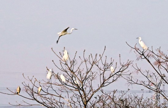 除了白鹭,“岛”上还有夜鹭、灰鹭等多种鹭鸟。“岛”四周的水荡里,还栖息着野鸭、翠鸟、红嘴黑水鸡等多种水鸟。