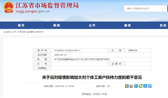 近日,江苏省市场监管局官网发布《关于应对疫情影响加大对个体工商户扶持力度的若干意见》,全力支持个体工商户复工复产。