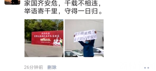 在等候李勤归来时,记者问张育峰,他最想对妻子说的话是什么,这位理工男含羞地红了脸,表示自己不善言辞,不过,他早早在自己的朋友圈里写下了自己的心意:“家国齐安危,千载不相违。举语寄千里,守得一日归。”