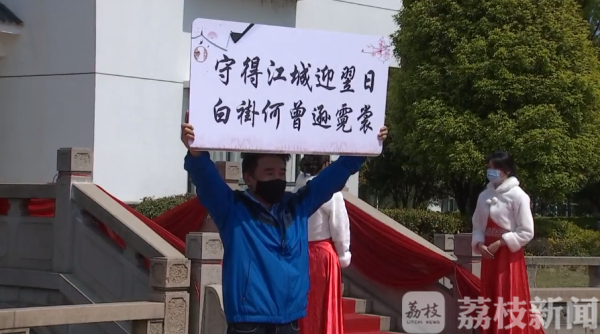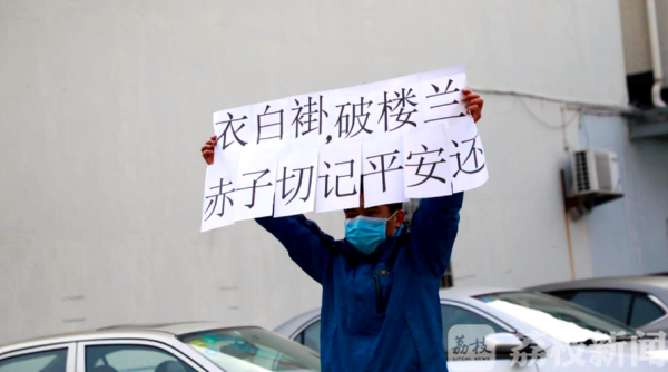 此前,在妻子刚从武汉返回苏州时,丈夫张育峰就赶到现场迎接妻子归来,并再次举牌:“守得江城迎翌日,白褂何曾逊霓裳”。