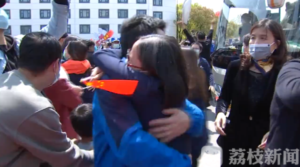 上午十点多,常熟援湖北医务人员乘坐的返程大巴车驶进了常熟会议中心 。李勤走下大巴车,一眼就看到了早早守候在人群里的丈夫,冲上去与他紧紧相拥。