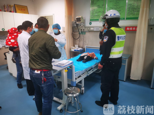 五分钟之后,两位辅警将婴儿安全护送至医院。经过仔细检查,发现孩子只有嘴唇外部有接触药物,口腔和呼吸道未发现被物灼伤现象。