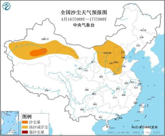 中国天气网讯 中央气象台4月16日06时继续发布沙尘暴蓝色预警:受蒙古气旋和冷空气大风影响,预计4月16日08时至17日08时,新疆南疆盆地、甘肃河西、内蒙古中西部、陕西北部、山西中北部、河北中南部、北京、天津、河南北部等地的部分地区有扬沙或浮尘天气,其中,新疆南疆盆地局地有沙尘暴。